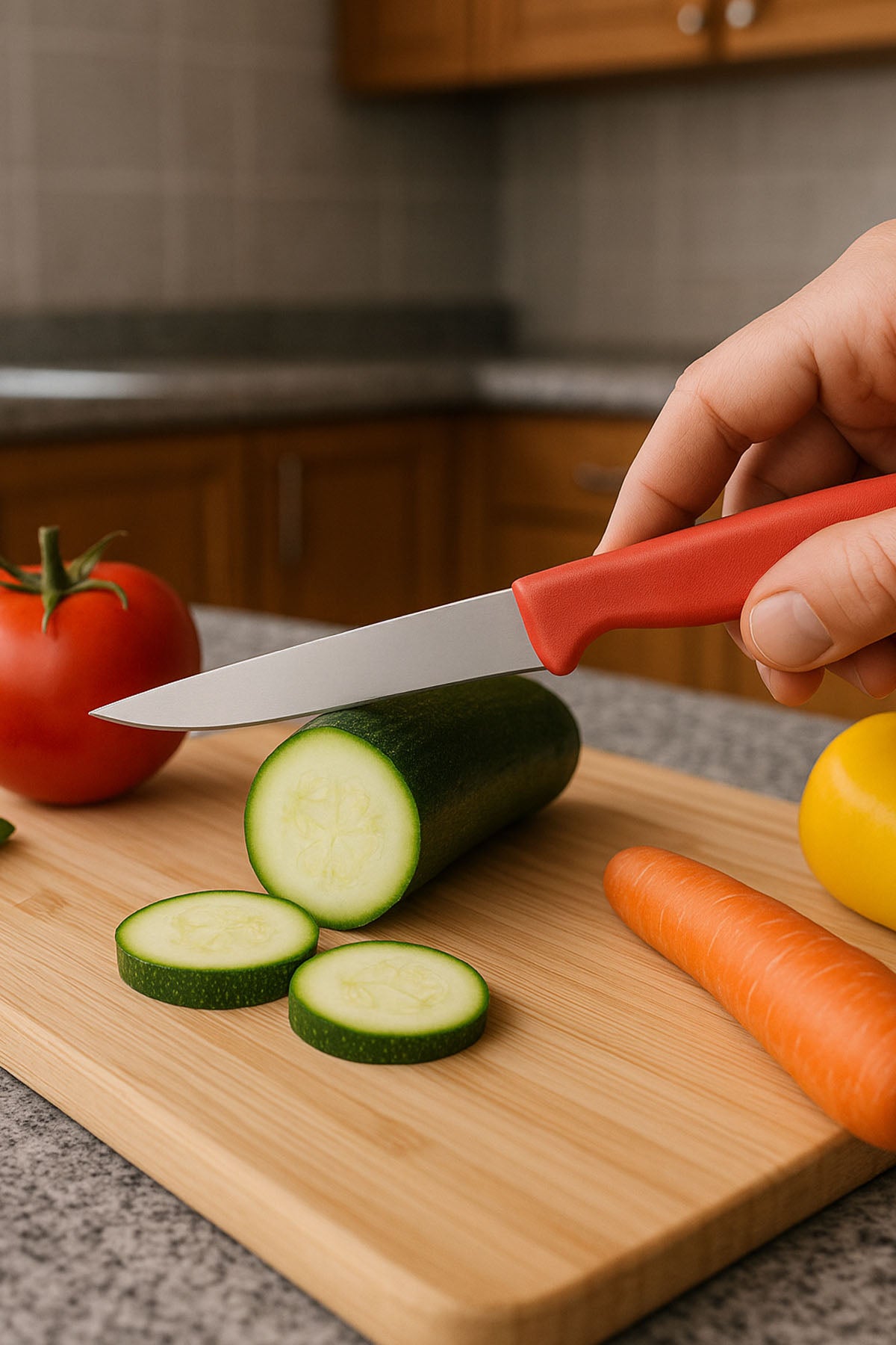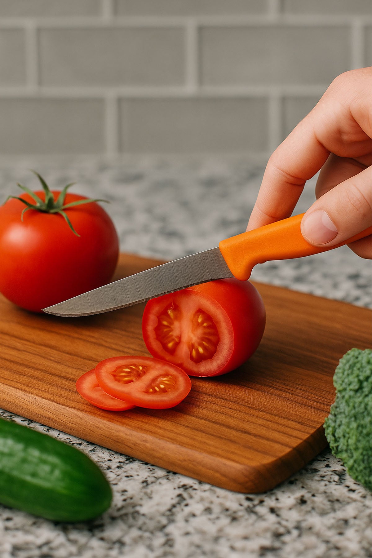 Mutfakta güvenle doğru kesimler yapmak isteyenler için tasarlanmış bu model, yüksek kalite çelik yapısı ve ergonomik tasarımıyla öne çıkar. Tek parça gövdeli yapısıyla hijyeni artırırken, 9 – 10 cm civarındaki kullanım uzunluğu ile sebze–meyve doğrama işleri için ideal performans sunar.