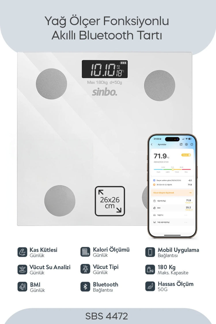 SİNBO SBS-4472 BEYAZ YAĞ ÖLÇER AKILLI BLUETOOTH CAM BASKÜL