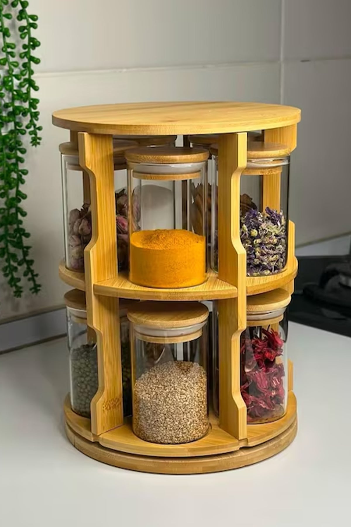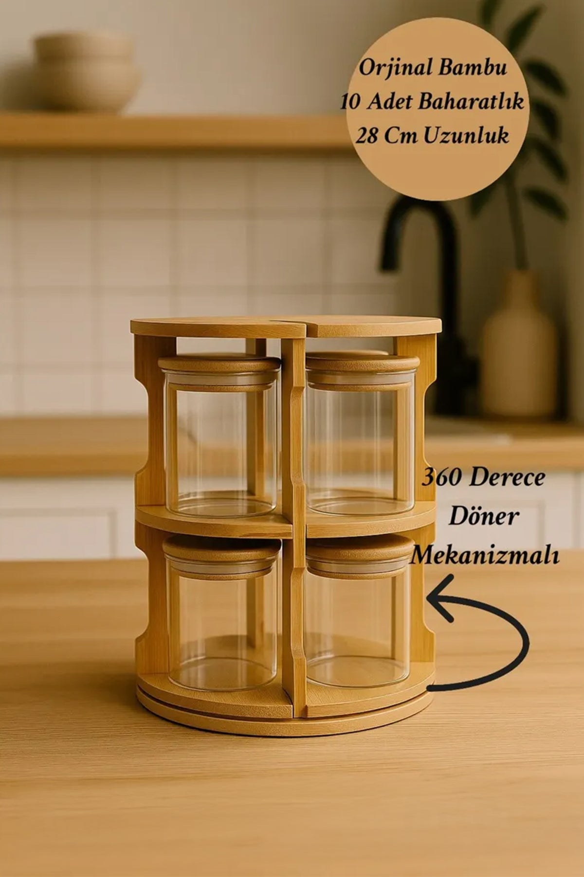 İBİCO 10 PARÇA YUVARLAK & DÖNER STANDLI BAMBU KAPAK BAHARATLIK