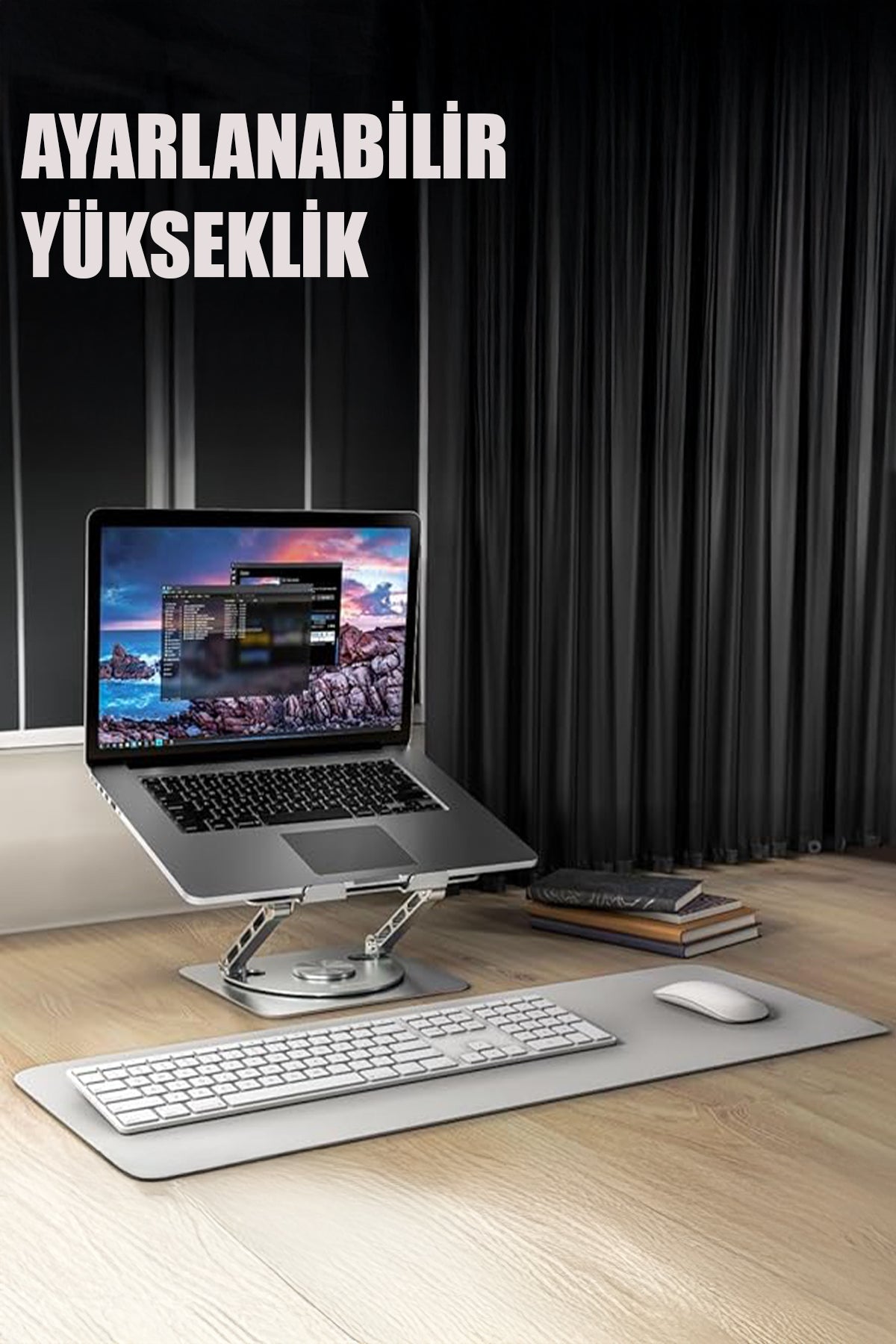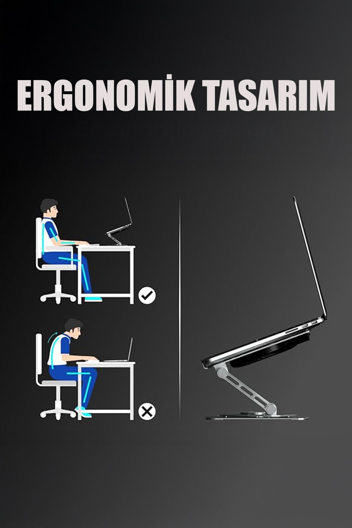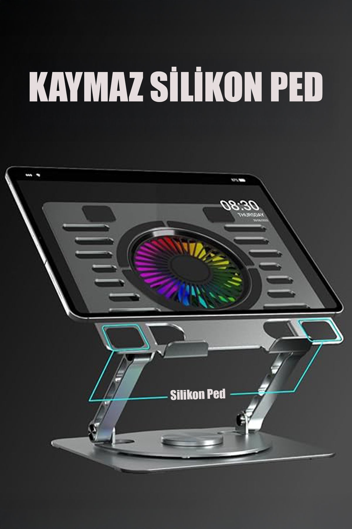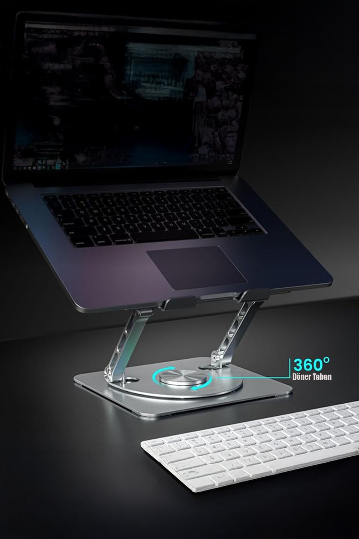 🔹 360° Döner Tasarım: Stand, özel 360 derece dönebilen mekanizması sayesinde kullanım esnekliği sunar; masa başında farklı açılardan rahat çalışma sağlar.