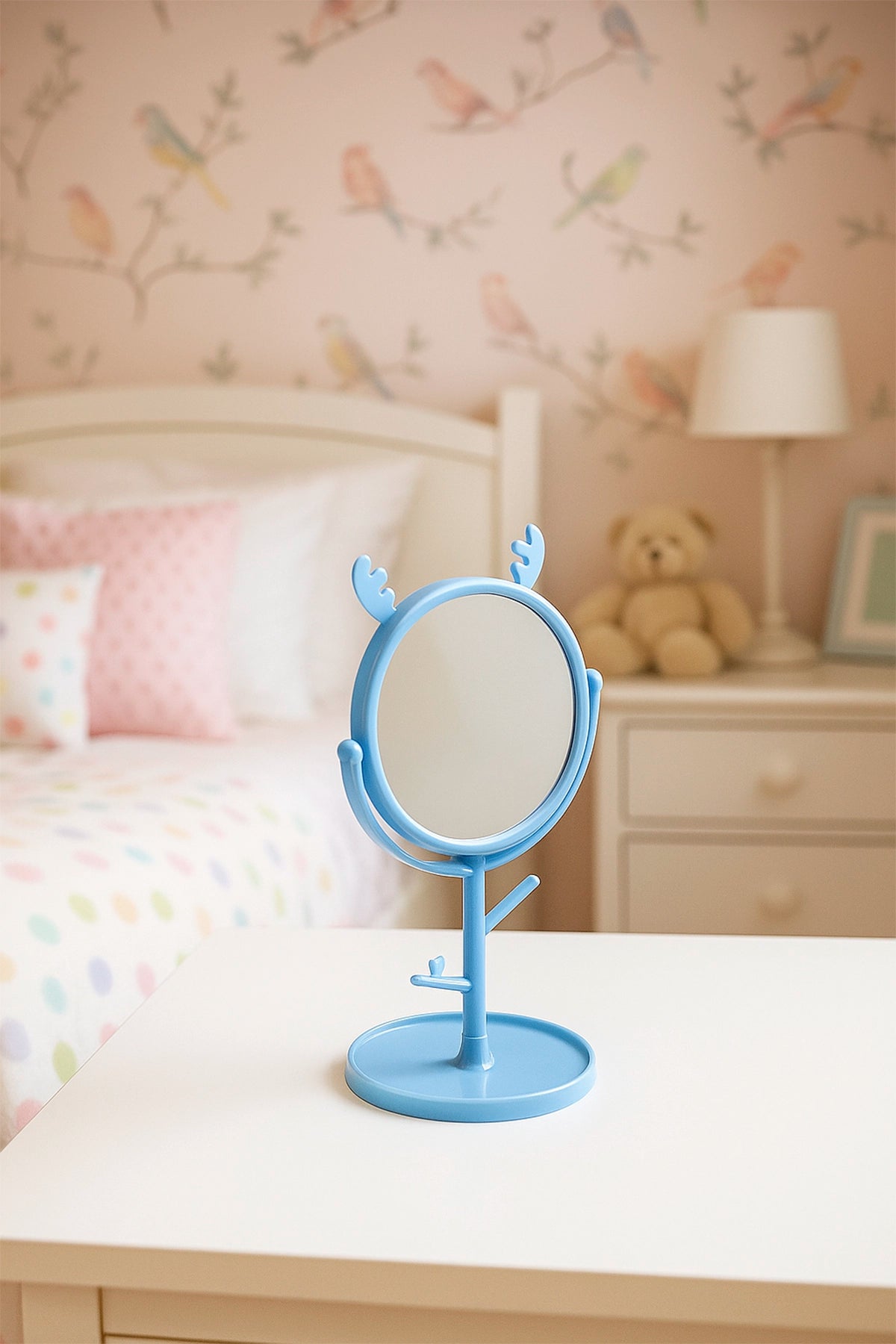 Sevimli geyik boynuzlu ayak ve entegre takı askılığıyla masaüstünüze hem şıklık hem de fonksiyon katacak kompakt bir makyaj aynası.