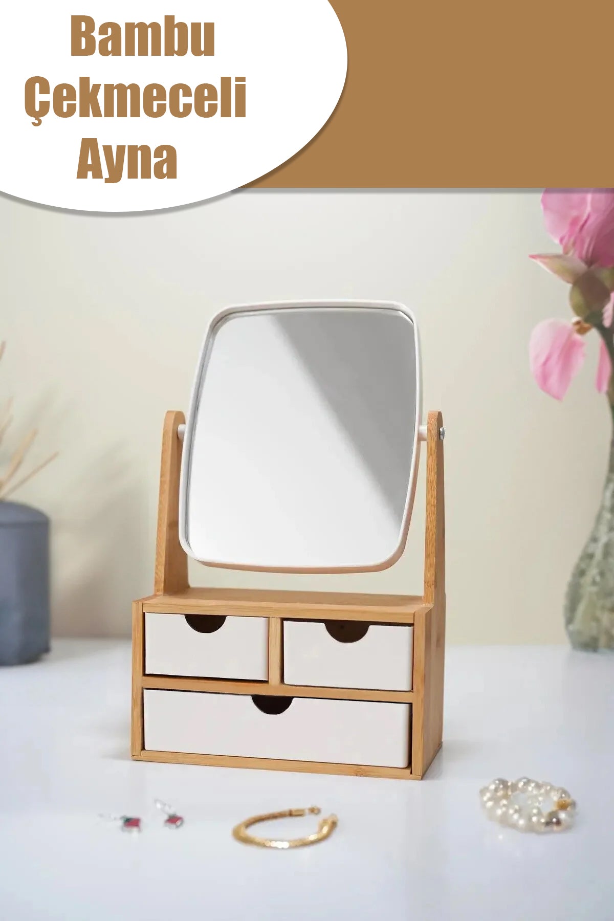 3 ÇEKMECELİ BAMBU AHŞAP STANDLI MAKYAJ AYNASI