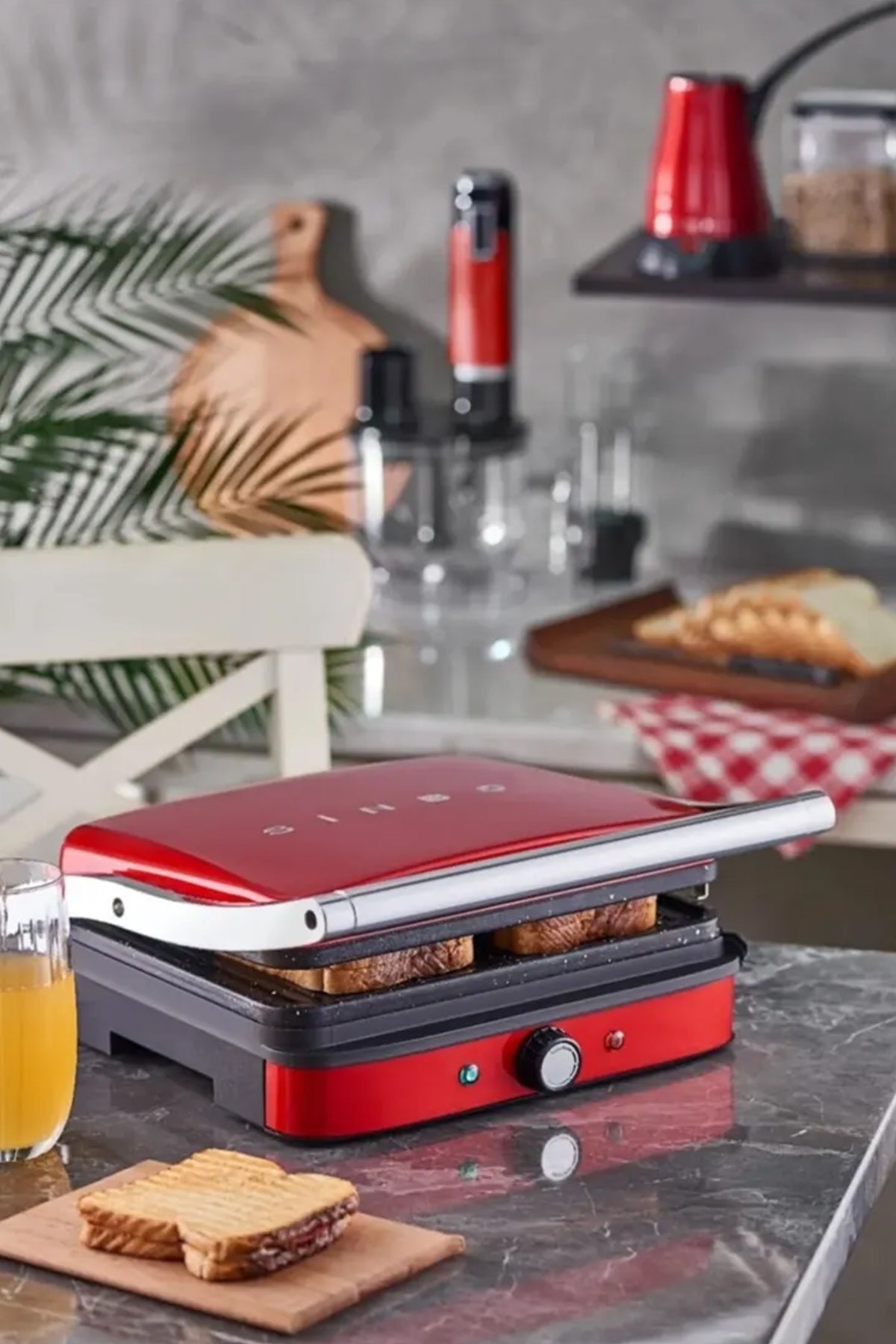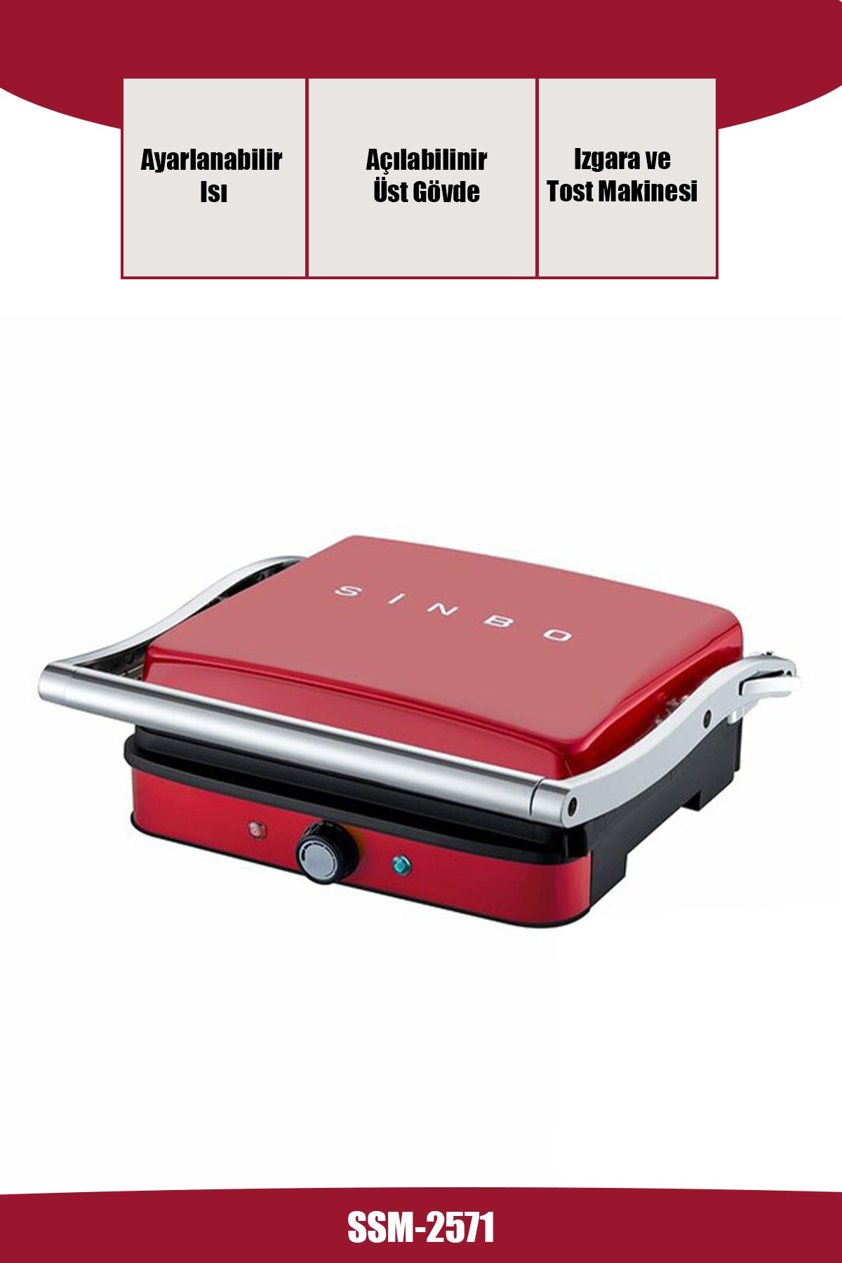 Evinize şıklık katan kırmızı tasarımıyla Sinbo SSM-2571, ızgara ve tost keyfini bir arada yaşatmak isteyenler için ideal bir mutfak dostudur. Ayarlanabilir ısı kontrolü, 180° açıyla açılabilen üst gövdesi ve pratik kullanımıyla hem ızgara hem tost yapımında esneklik sunar.