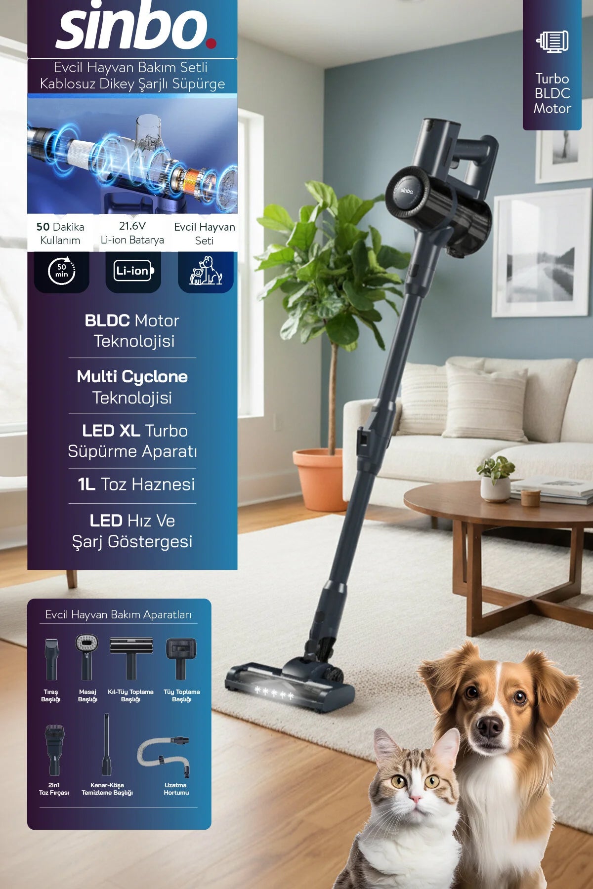 SİNBO EVCİL HAYVAN BAKIM SETLİ KABLOSUZ ŞARJLI DİKEY SÜPÜRGE