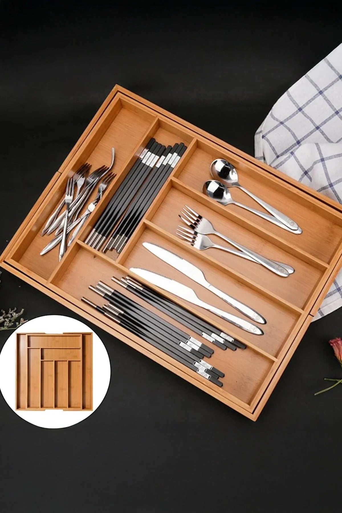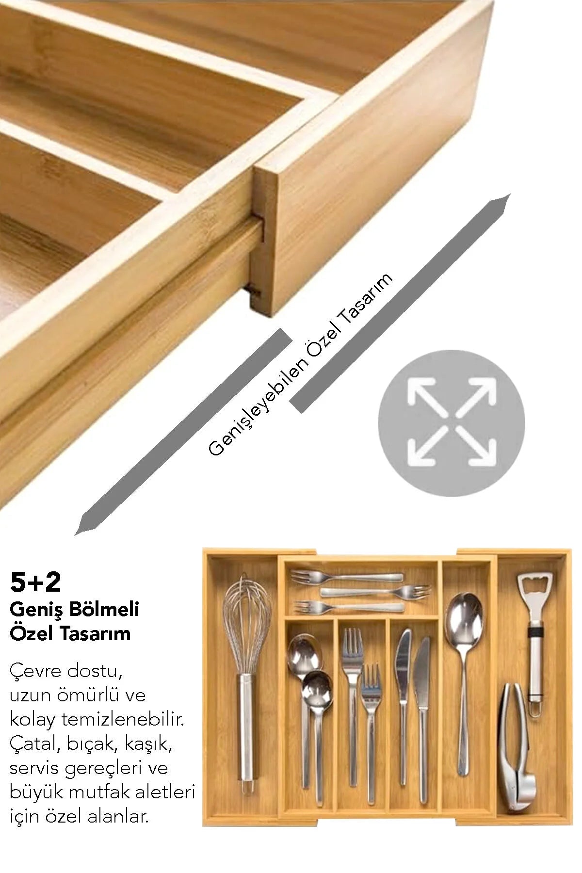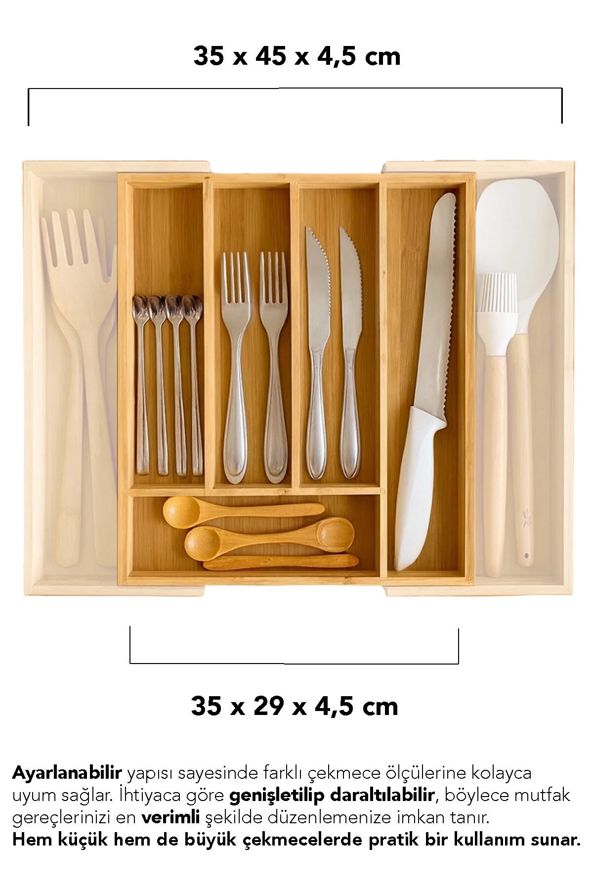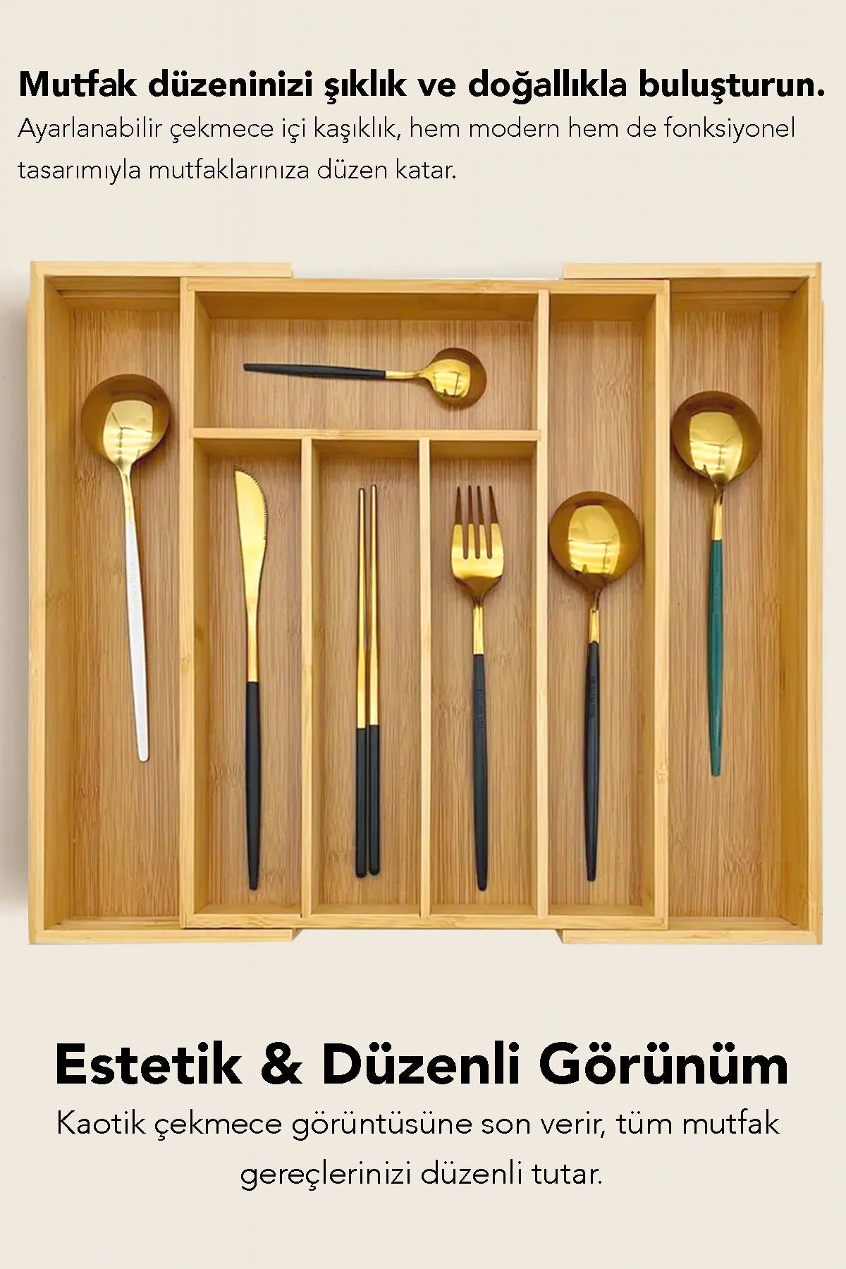 Bu kaşıklık ile kaşık, çatal, bıçak gibi mutfak gereçlerini tek bir alanda derli toplu şekilde saklayabilir; çekmece içindeki aradığınız objeyi kolayca bulabilirsiniz. Bambu malzeme hem hafif hem de dayanıklıdır, doğallığıyla mutfak dekorunuza sıcaklık katar.
