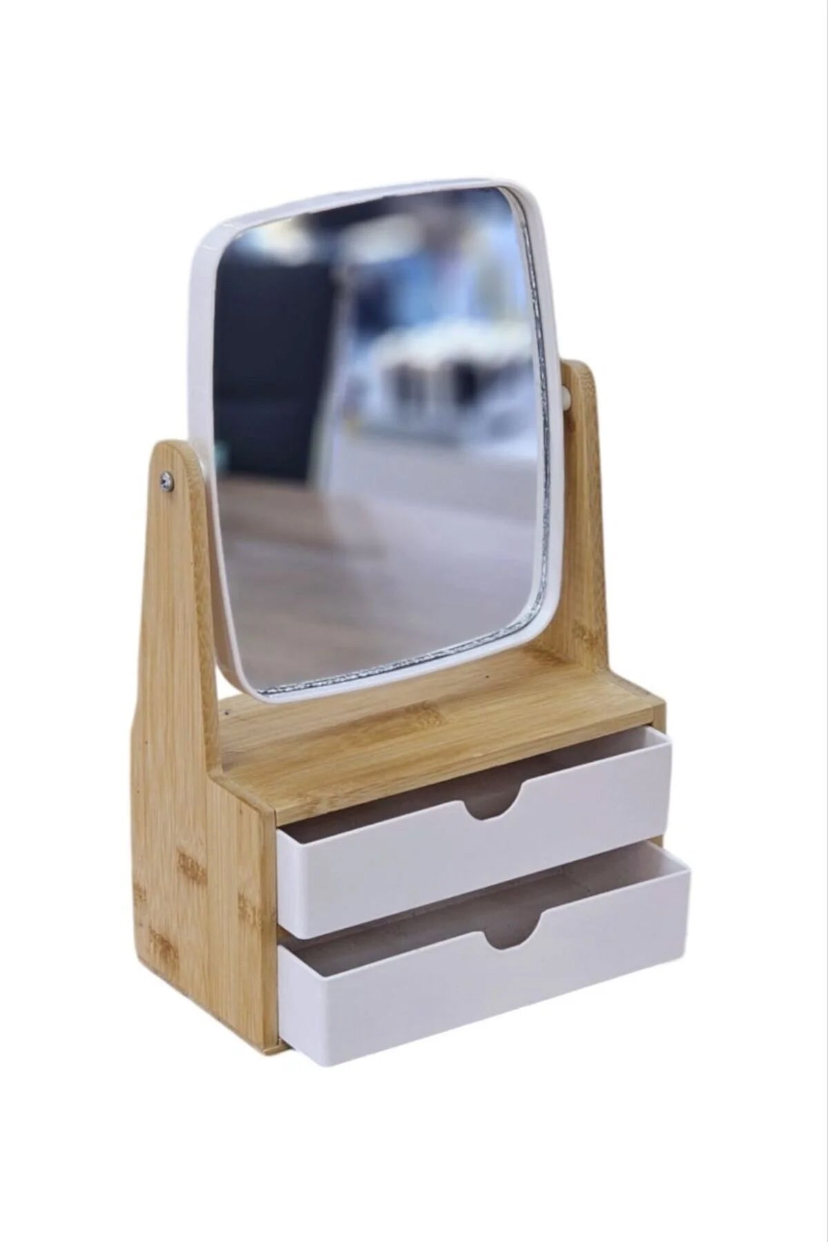 2 ÇEKMECELİ BAMBU AHŞAP STANDLI MAKYAJ AYNASI