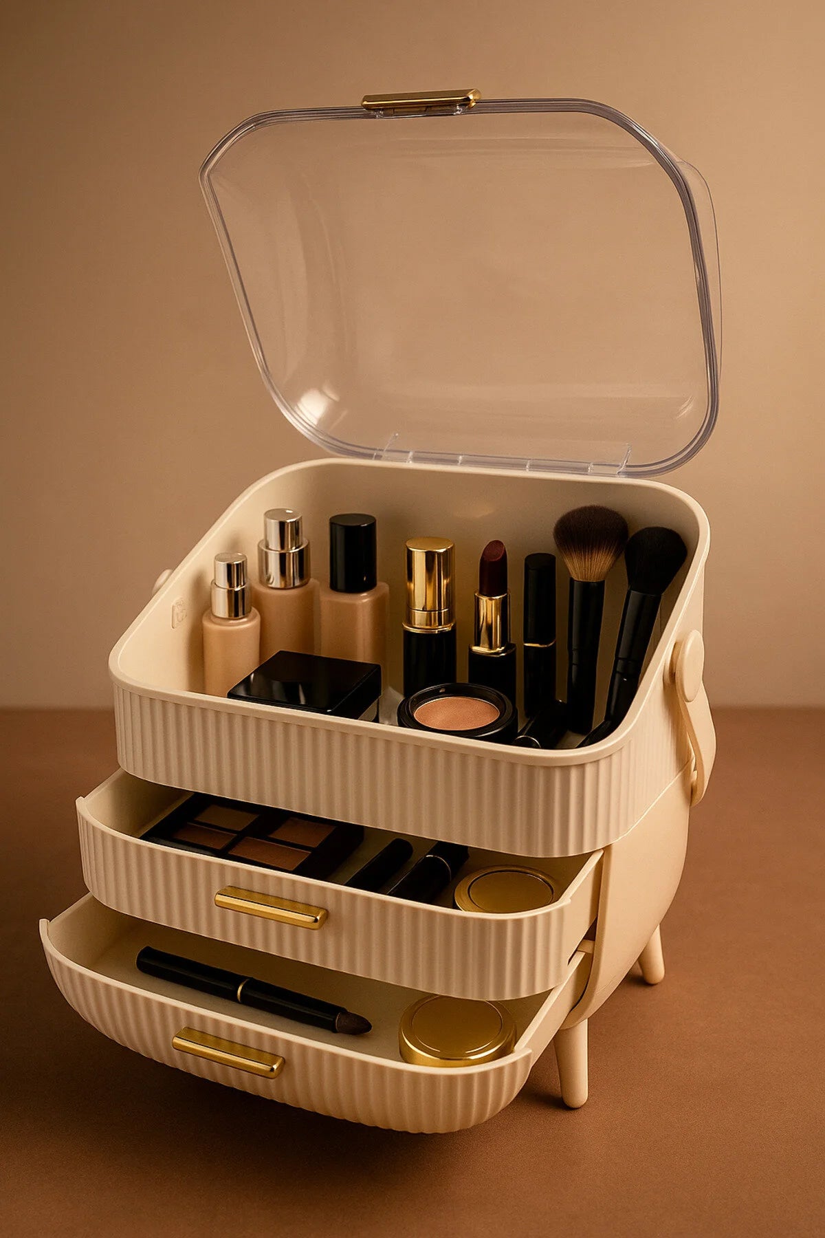 Evde düzeni sağlamak isteyenler için şık, fonksiyonel ve çok yönlü bir çözüm! Bu ürün; makyaj malzemelerinizi, takılarınızı, aksesuarlarınızı ya da küçük bakım eşyalarınızı düzenli tutmanızı sağlayacak bir organizerdir. Aşağıda öne çıkan özelliklerine göz atabilirsiniz: